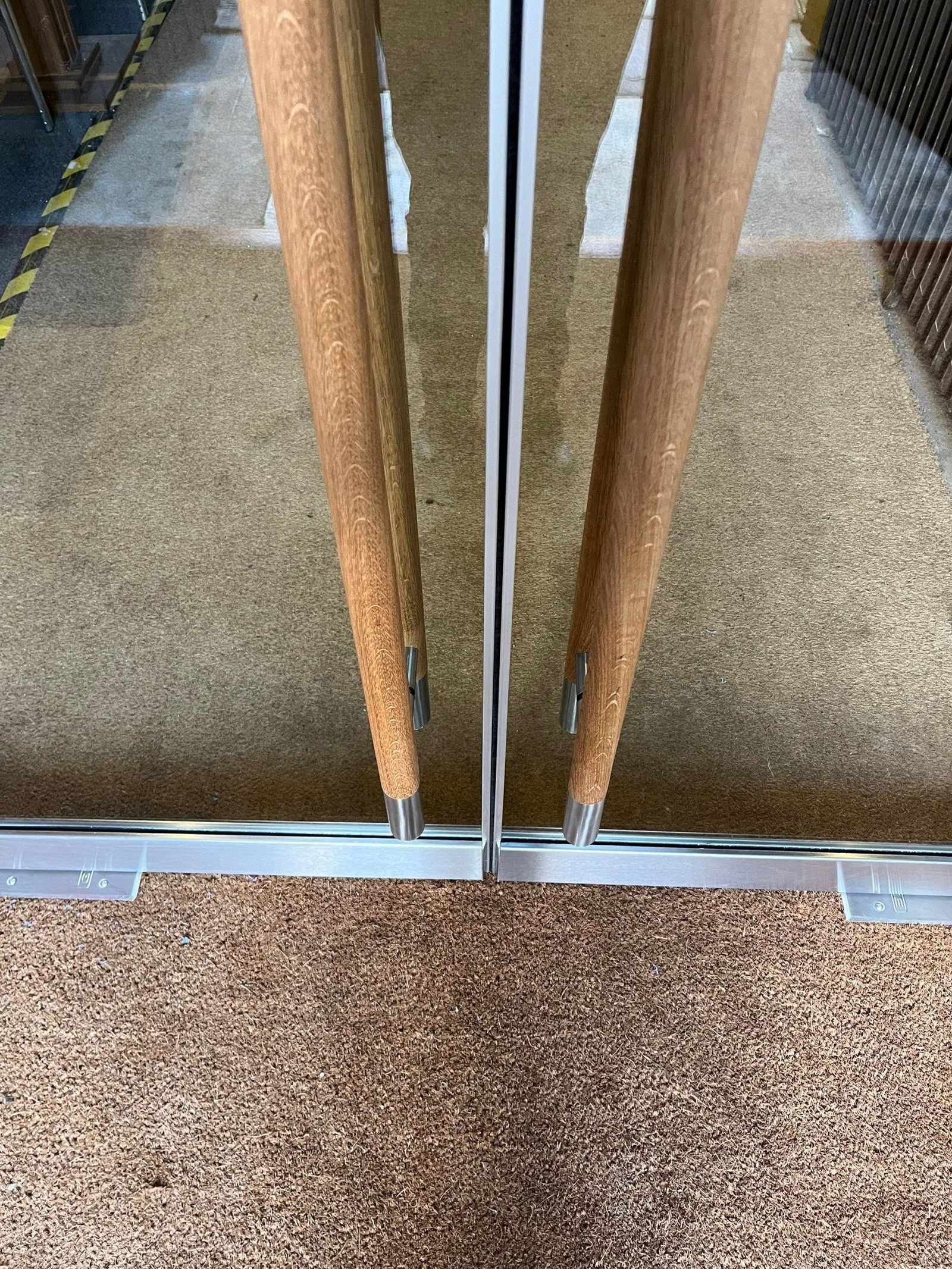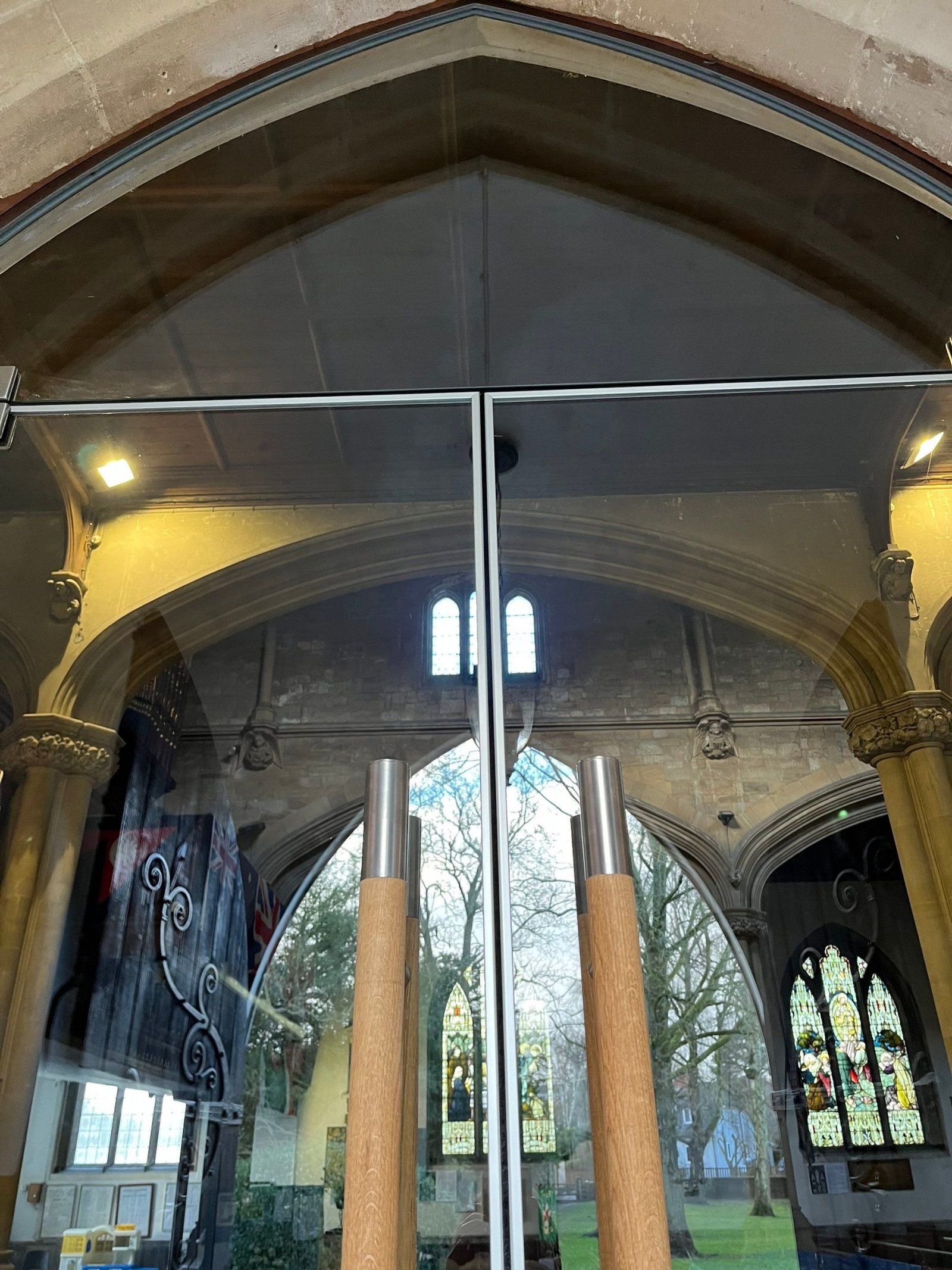 12mm thick toughened clear glass panels were processed to match the shape of the existing arched opening and set into bespoke glazing channel to the perimeter edge. The doors were mounted onto recessed hydraulic closers, secured with pinch free patch fittings and fitted with large oak pull handles and vinyl manifestation “crosses” to reflect the Church.